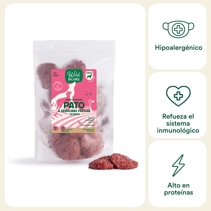 La carne de pato, además de ser muy nutritiva y de tener un sabor muy peculiar que les encanta, es una carne hipoalergénica que la hace perfecta para dietas de descarte en perros con posibles alergias alimentarias