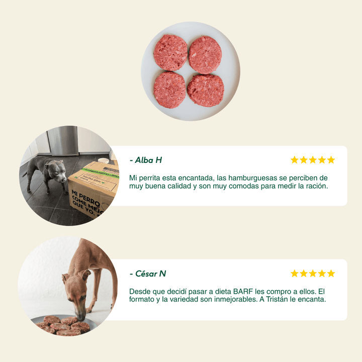 El menú BARF Pavo para perros Wild Balance no solo es para ellos, también está pensado para ti. Con nuestro cómodo formato de hamburguesas de 50g te será muchísimo más fácil alimentar a tu perro con comida natural. Es muy sencillo de racionar la comida en el caso de perros pequeños o incluso de perros grandes, ya que no tendremos que estar dividiendo grandes cantidades, simplemente cogeremos el número de hamburguesas que tenga que comer. ¿Ves que fácil?