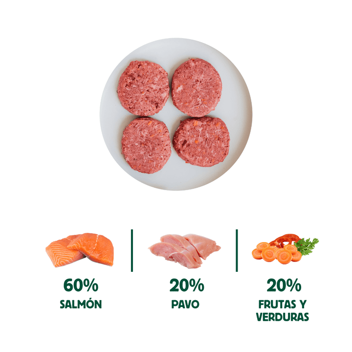 Menú BARF de salmón con verduras frescas para perros de todas las edades. Con dos tipos de proteínas, salmón y pavo. La carne de salmón es una excelente fuente de proteínas y ácidos grasos omega-3 para los perros. Es rica en proteínas de alta calidad y ácidos grasos omega-3 que son beneficiosos para la salud del corazón, el cerebro y la piel de los perros. El delicioso menú completo de salmón no puede faltar en su alimentación mensual. ¡Seguro que le encanta!