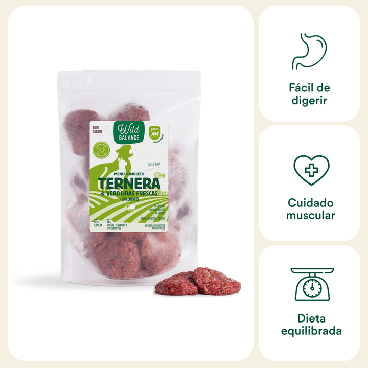 Menú BARF de ternera con verduras frescas para gatos de todas las edades. Monoproteico.