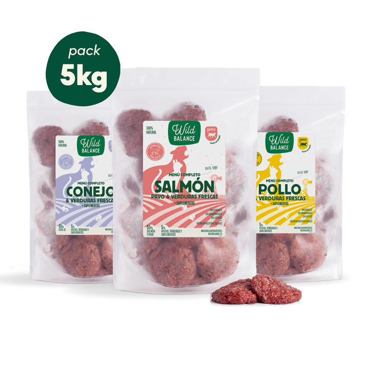 Si ya te has decidido y quieres alimentarle con comida natural, necesitas nuestro pack de dieta BARF de iniciación para gatos. Incluye 1kg del menú completo de salmón y pavo con verduras, 2kg del menú completo de pollo con verduras frescas y 2kg del menú completo de conejo con verduras frescas. Todas las proteínas que componen el pack de iniciación al BARF para gatos son muy ligeras, perfectas para que el organismo se adapte a la nueva comida y tengan buenas digestiones los primeros días de la transición.