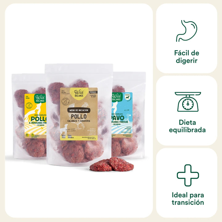 Para una mejor transición a BARF, inicia con nuestro Menú de Iniciación (80% pollo, 20% zanahoria y calabaza), ideal para facilitar la digestión en los primeros días.